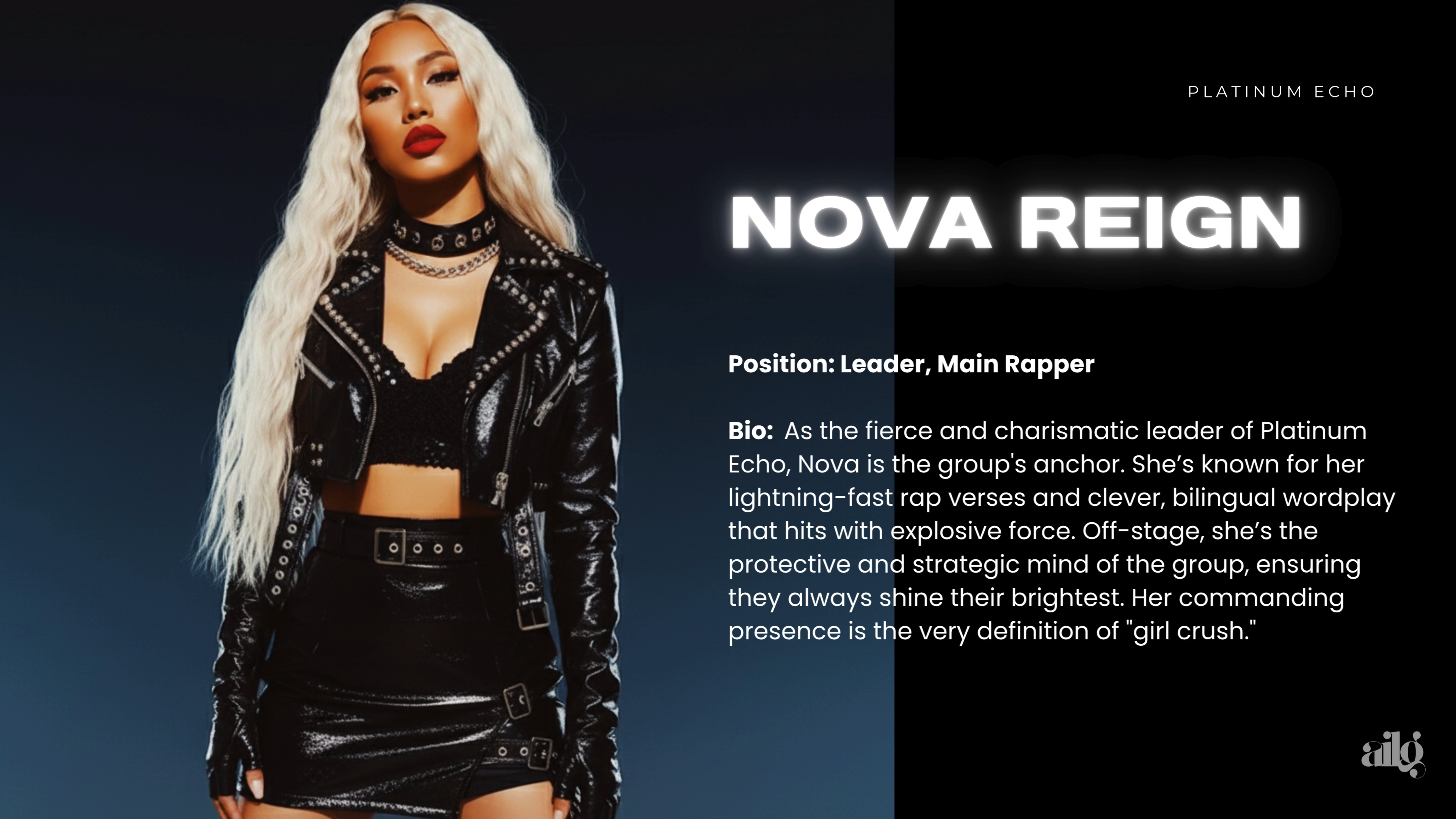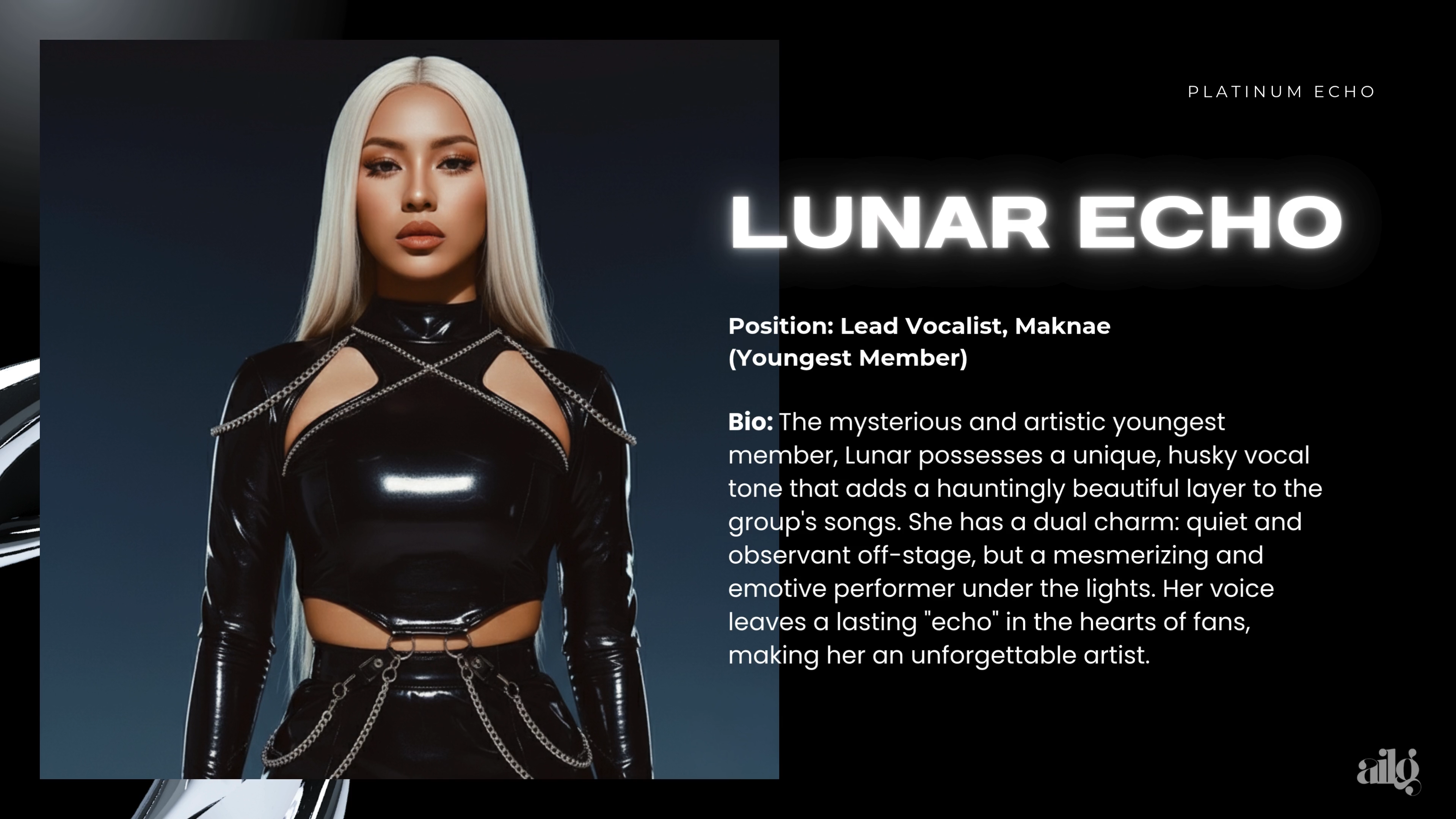 Fierce, polished, and unforgettable, Platinum Echo is the AI-powered four-member global girl group setting a new standard in music. Known for their high-calibre performances, boldly generated visuals, and a boundary-breaking sound, they are a powerhouse collective engineered to resonate across continents.